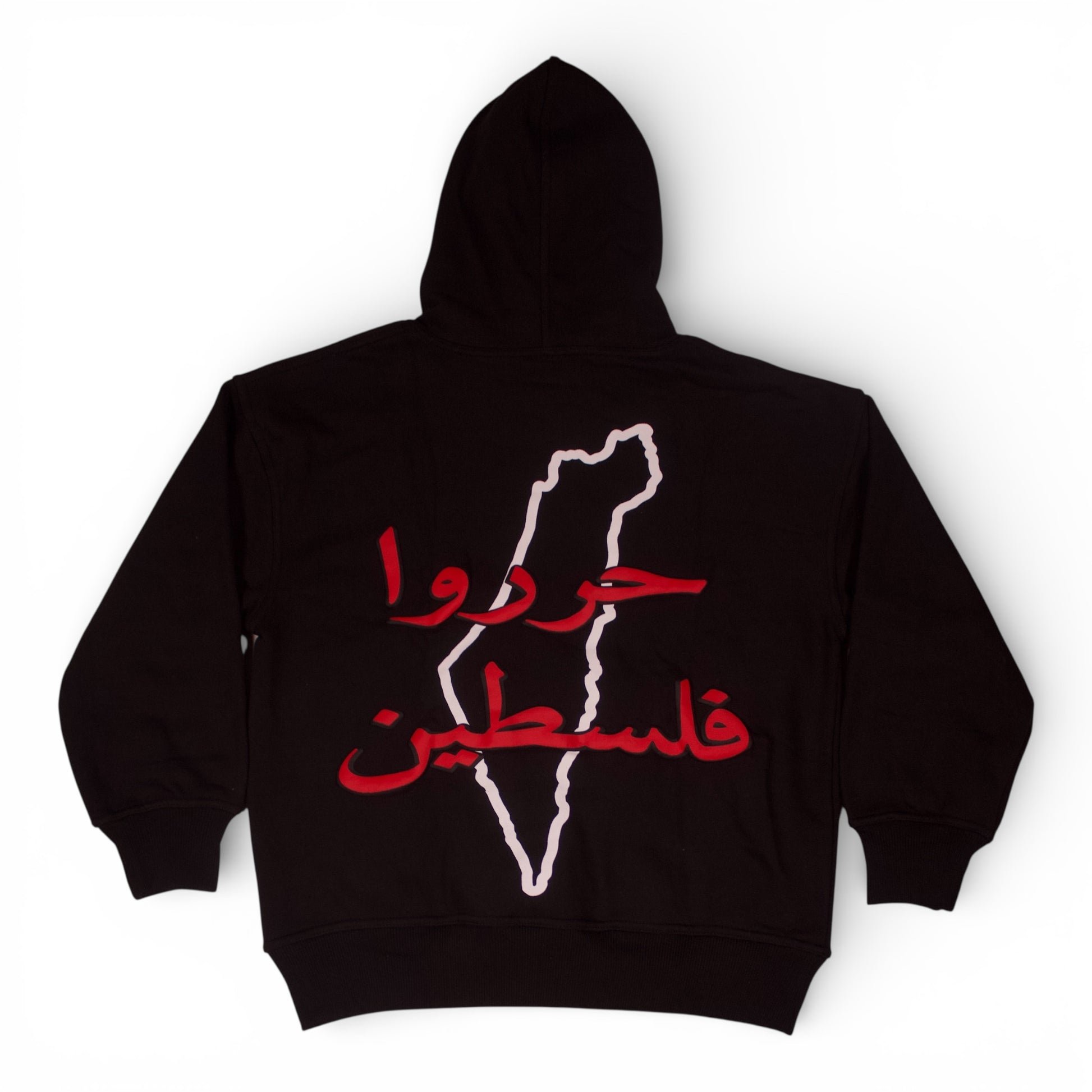 This black over-sized hoodie is made from 100% cotton with thick 450 GSM fabric, so it’s soft and warm. The back has a big puff print, and a plain white map border with DTF print. The hood has cool embroidery, with a small embroidered flag for style. It’s perfect to wear every day and looks great with any outfit.
